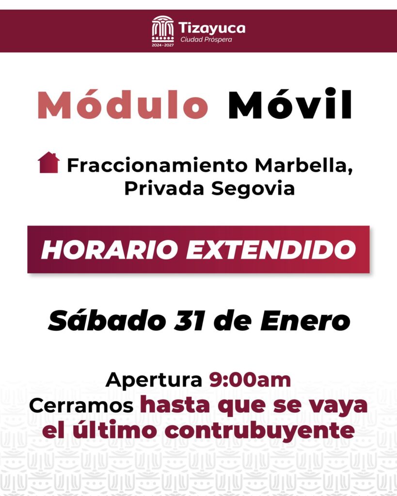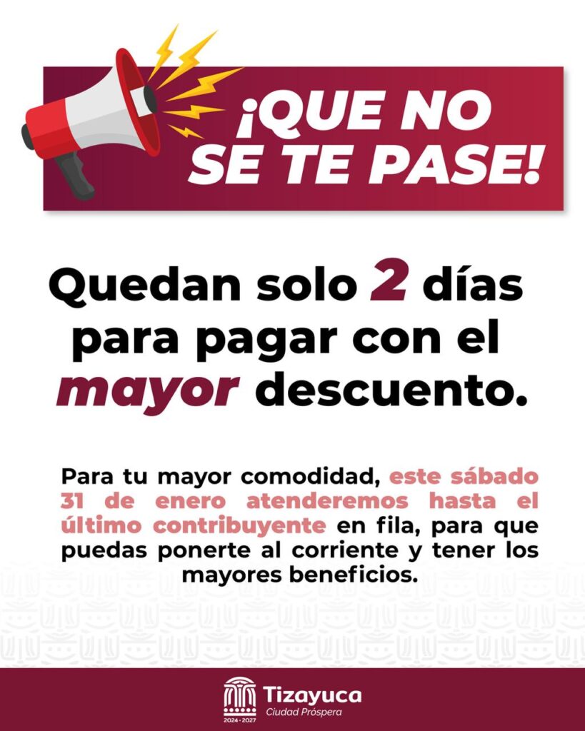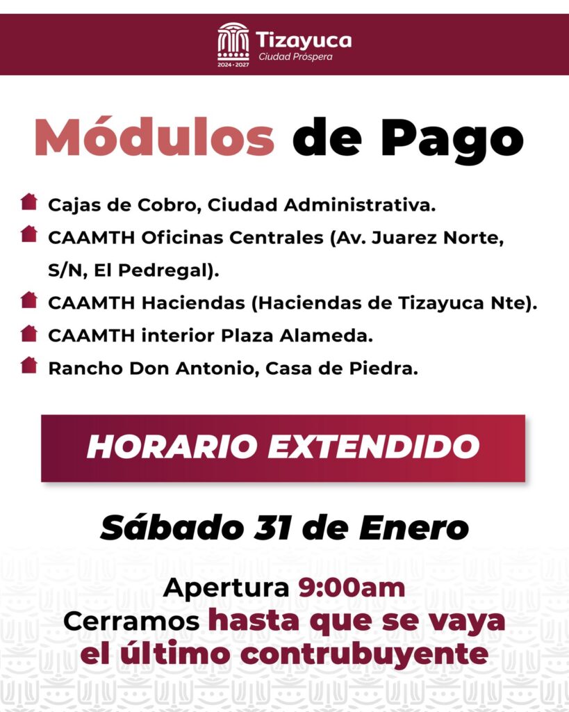 El Gobierno Municipal de Tizayuca anuncia que los módulos de pago operarán de manera especial este sábado 31 de enero. Esta jornada extraordinaria responde a la alta afluencia de contribuyentes que buscan obtener el descuento máximo del 20% por anualidad anticipada del primer mes del año. Por ello, la administración local ha dispuesto que, aunque el servicio inicia a las 9:00 hrs. y concluye a las 13:00 hrs., el personal de cajas extenderá su labor hasta brindar atención integral al último ciudadano formado, garantizando así que todos los asistentes logren formalizar su pago y proteger su patrimonio bajo los términos de este incentivo anual.