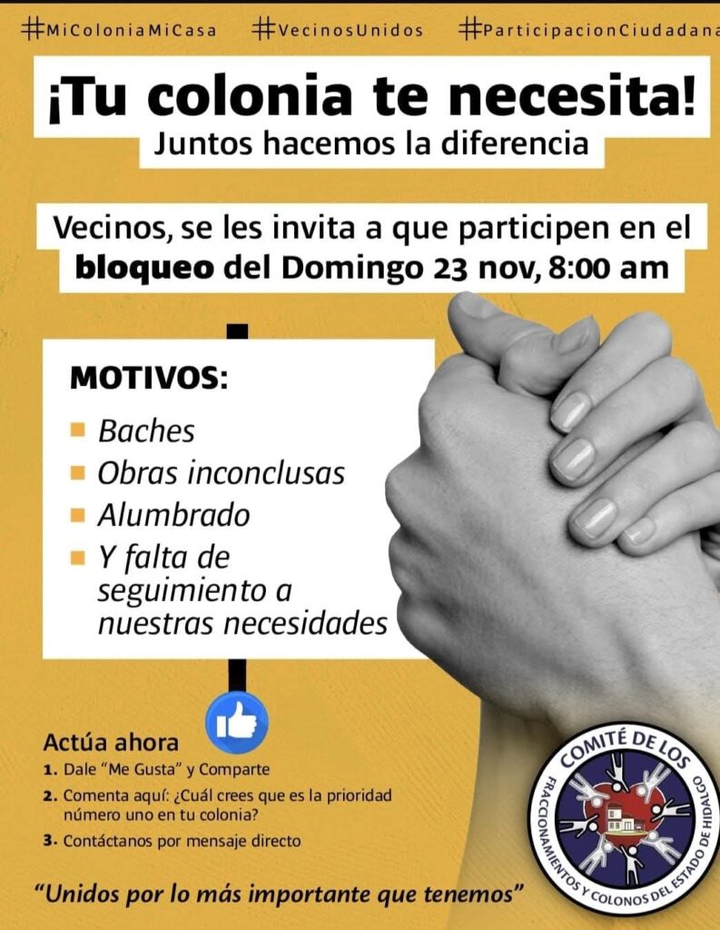 El Comité de Fraccionamientos del Sur convocó a un bloqueo ciudadano el próximo domingo 23 de noviembre a las 8:00 de la mañana, sobre la carretera México–Pachuca, a la altura del centro comercial Explanada, como medida de protesta ante lo que califican como abandono por parte de las autoridades estatales y municipales.