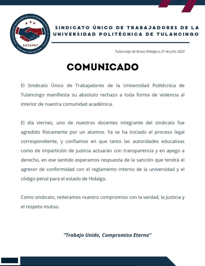 En respuesta a esta situación, el Sindicato Único de Trabajadores de la Universidad Politécnica de Tulancingo (SUTUPOT) emitió un comunicado oficial este domingo, manifestando su rechazo absoluto a cualquier acto de violencia dentro de la comunidad académica.